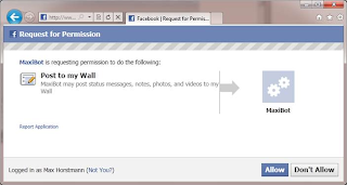 After opening http://maxifacebookbot.cloudapp.net, the app indeed redirects to the Faceboot login page. After logging in, the user has to confirm the special permissions requested by the application: